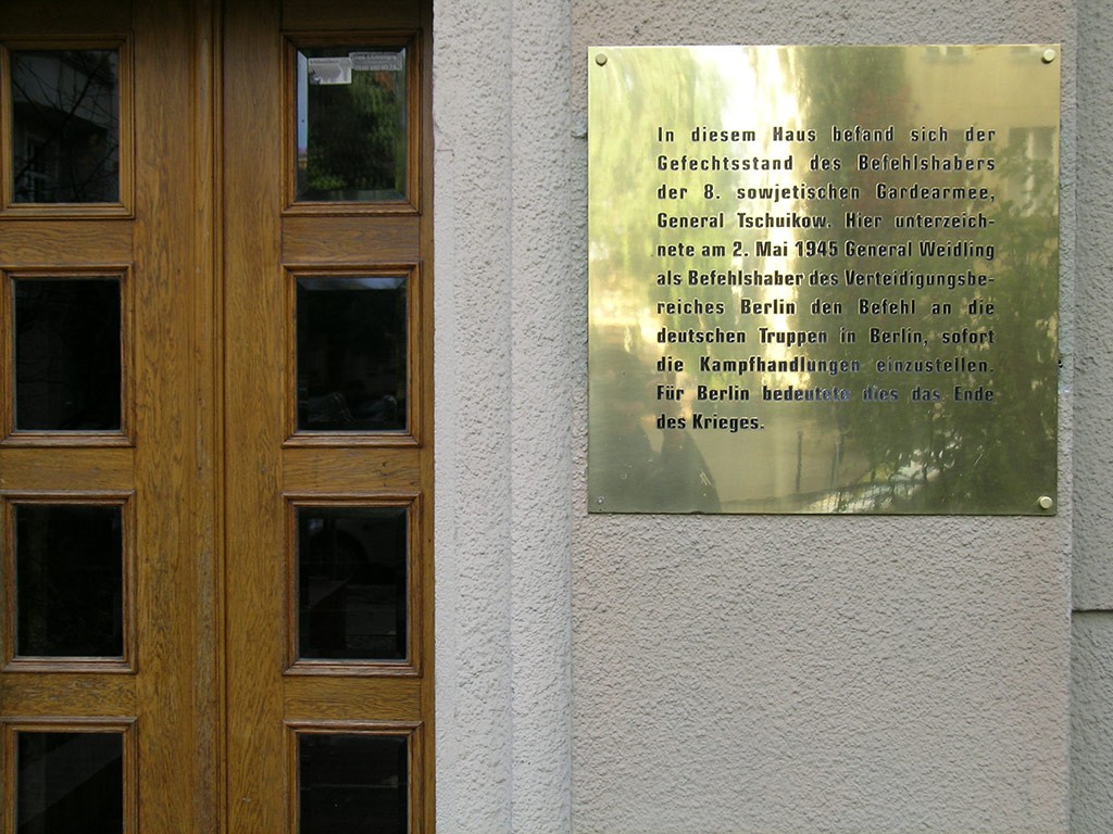 Further along, the walk passes the former location of the New Reich Chancellery, then continues to the Detlev-Rohwedder-Haus, one of the few major Nazi-era government buildings still standing. The Topography of Terror Museum, located on the site of the former SS and Gestapo headquarters, offers insights into the Nazi regime’s operations. At the Berlin Story Bunker, visitors can explore exhibits on Berlin’s wartime experience. The route then moves toward Anhalter Steg, once part of a major railway station, before reaching the house located at Schulenburgring 2. Soviet General Vasily Chuikov had his headquarters in this building and it was also the location where German General Helmuth Weidling, the commander of the Berlin garrison, signed the surrender order for Berlin on 2 May 1945.
